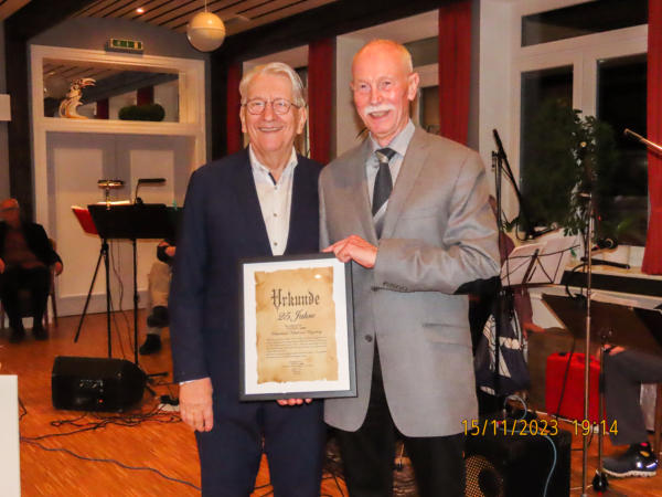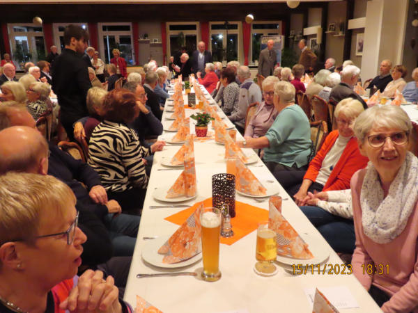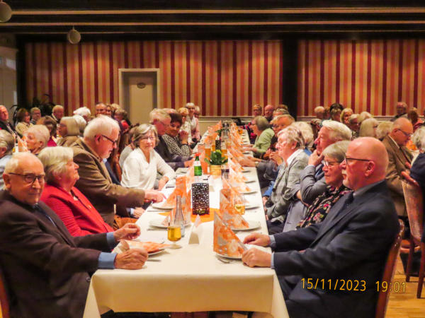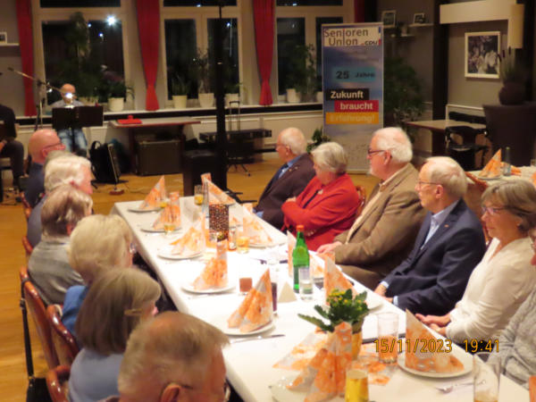 Traditionelles Grünkohlessen in Verbindung mit der Feier zum 25-jährigen Bestehen des Ortsverbandes Niebüll und Umgebung am 15.11.2023Hallo, liebe Senioren, wer nicht dabei war, hat etwas Tolles versäumt.Schon früh waren die eifrigen Senioren im Saal des Friesenhofes angekommen. Die Feier zum 25-jährigen Bestehen des Ortsverbandes Niebüll u.U. war für 17:30 Uhr angesagt, aber als wir um kurz vor 17:00 Uhr ankamen, war der Saal schon gut gefüllt (nordfriesische Eigenart, sehr pünktlich zu solchen Festen zu erscheinen).126 Teilnehmer, Senioren unseres Ortsverbandes, interessierte Gäste und geladene Ehrengäste waren angemeldet und kamen auch. Gekommen sind die Vorsitzenden der Ortsverbände des Kreises Nordfriesland und zwar Carsten Harder (OV Stollberg), Wolfgang Borchert (OV-Leck und Karrharde), Christian Carstensen (OV-Süderlügum) der Kreisvorsitzende der Senioren Union Jürgen Feddersen, der Landesvorsitzende der Senioren Union Dieter Holst, der Bürgermeister der Stadt Niebüll Thomas Uerschels, die Vorsitzende des CDU-Ortsverbandes Niebüll Kathrin Pohns, der Fraktionsvorsitzende der CDU-Fraktion in der Niebüller Stadtvertretung Kjell Pohns, der stellvertretende Kreisvorsitzende der CDU-NF Leif Bodin, sowie der ehemalige Ministerpräsident des Landes Schleswig-HolsteinDr. h.c. Peter Harry CarstensenNach der Begrüßung durch den Vorsitzenden wurden von einigen Gästen Grußworte an die Versammlung gerichtet. Der Vorsitzende hielt einen kleinen Rückblick auf die vergangenen 25 Jahre und begrüßte dabei auch die beiden anwesenden GründungsmitgliederTea Clausen undGuido Tödt, der auch zugleich Ehrenbürger der Stadt Niebüll ist.Nach dem traditionellen Grünkohlessen, bei welchem wir von den Morinos vorzüglich mit Tafelmusik unterhalten wurden, übernahm Peter Harry Carstensen das Mikrophon, um uns mit launigen, lustigen und auch ernsten Begebenheiten aus seiner aktiven politischen und aus der gegenwärtig aktuellen Zeit zu unterhalten. Er habe sich gefreut darüber, dass der Ortsverband ihn angesprochen hat, an dieser Feier teilzunehmen. Er hat sehr gerne zugesagt und die zahlreichen Teilnehmer wären ja auch der Beweis dafür, dass in unserem Ortsverband eine gute Stimmung herrscht. Nach dem Vortrag von Peter Harry Carstensen spielten die Morinos schon längst vergessene, aber immer noch bekannte Melodien und damit zum Tanz auf, was einige Paare dann auch wahrnahmen und auf der Tanzfläche ihr Können zeigten.Eine schöne Feier ging dann gegen 22:00 Uhr ihrem Ende zu. Vielen Dank an den Vorstand für diese gut gelungene Veranstaltung zum 25-jährigen Bestehen des Ortsverbandes.