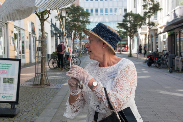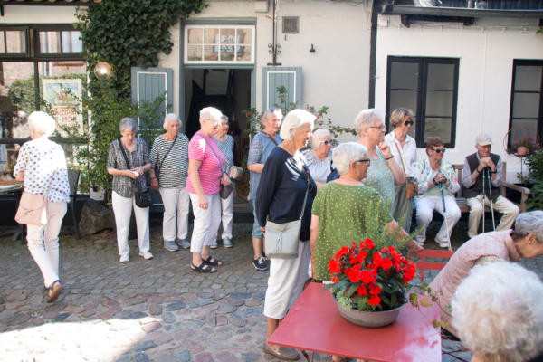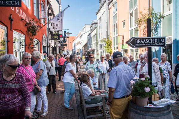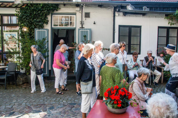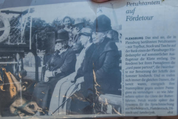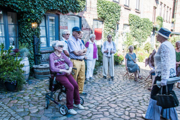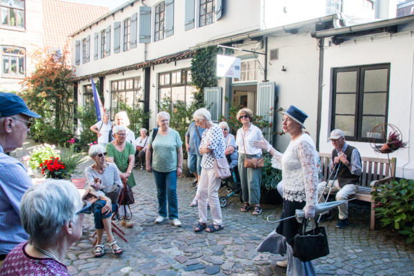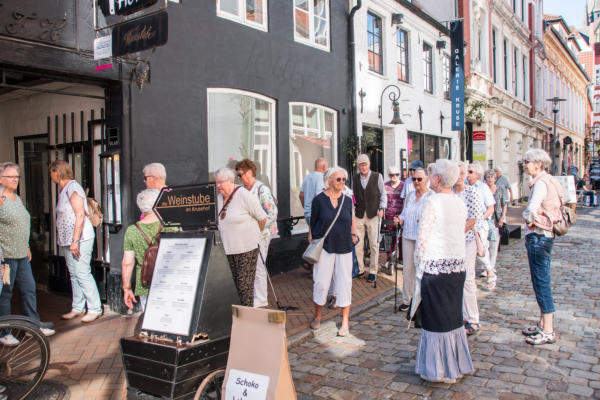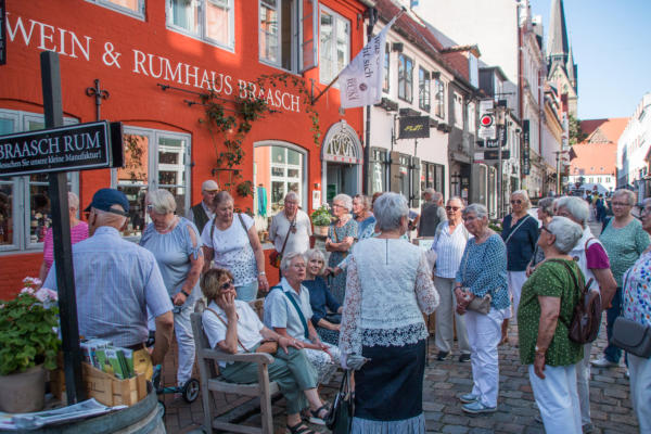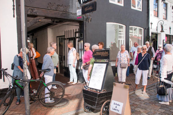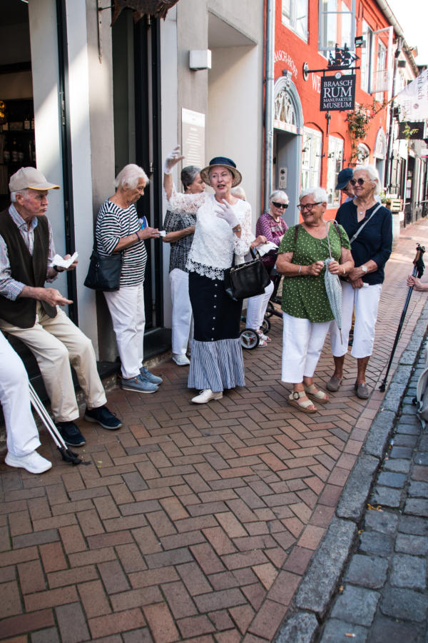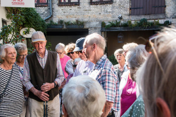 ½-Tagesfahrt nach Flensburg zur Stadtführung mit der Petuh Tante Emmi Hansen am 06.09.2023An diesem Mittwoch Nachmittag gegen 13:15 Uhr machten sich 26 Teilnehmer mit einem Bus von Thors-Reisen auf den Weg nach Flensburg. Die zertifizierte Stadtführerin Ruth Rolke erwartete uns am Wasserrad auf dem ZOB in Flensburg. Nach der Begrüßung verwandelte sich Ruth Rolke in die Petuh Tante Emmi Hansen. Es ging nun vom ZOB Richtung Südermarkt. Dort wurden dann einige Döntjes erzählt und die berühmten Flensburger Kaufmannshöfe erklärt.Zwischendurch verwandelte sich Emmi Hansen wieder zurück in Ruth Rolke, die die Verknüpfungen aus Sage und Historie anschaulich erklärte. Zum Beispiel wie auf dem Markt die Radischen aufgehübscht wurden, oder wie ein Original Hunde entführte und diese dann wieder unter Zahlung von Auslösungen für Futter etc. wieder zurückgab. Nun ging es weiter in die Rote Straße zur Besichtigung der Kaufmanns- und Handwerkerhöfe. Dort erwartete uns bei der Marzipan-Manufaktur ein kleiner Snack in Form einer Marzipan- und einer Lakritz-Kreation. Als Abschluss gab es dann noch einen kleinen Schluck eines hervorragenden Whisky-Likörs. Weiter ging es dann noch Richtung Rathaus zum Gebäude von Robbe und Berking, sowie an dem Braasch-Rumhaus vorbei zur Fischmanufaktur, an welcher wir drei verschiedene Fisch-Häppchen genießen durften. Danach war etwas freie Zeit für mögliche Einkäufe und gegen 16:30 Uhr brachte uns der Bus von Thors Reisen wieder sicher nach Niebüll zurück. Alles in allem eine gelungene Fahrt in die Vergangenheit der Flensburger Petuh-Tanten, vielen Dank an Ruth Rolke alias Emmi Hansen für diese außergewöhnliche Stadtführung.Nachstehend einige Impressionen von dieser Veranstaltung der Senioren Union Niebüll und Umgebung